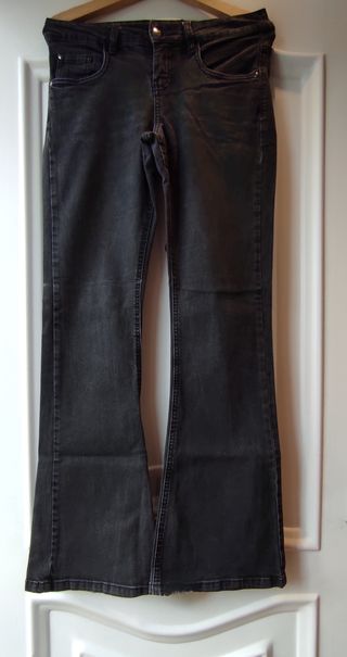 Pantalón vaquero de corte campana. Tela elástica. Cintura baja. Color negro. Muy cómodo. Talla S. Marca Esmara. Tiene el bajo un poco desgastado, en las fotos se ve. Medidas en fotos.