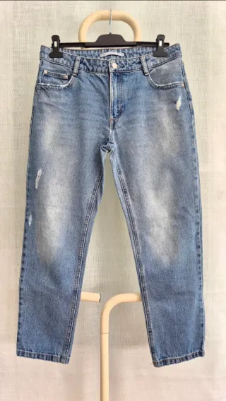 Pantalón vaquero de corte bombacho, tiro bajo. Tela no elástica. Hay fotos de las medidas - Diseño con bolsillos. - Detalle de cremallera en el bajo.