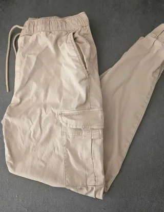 Pantalón tipo cargo de Bershka en color beige. Diseño moderno y cómodo. - Cintura elástica con cordón. - Bolsillos laterales. - Bolsillo cargo en el lateral.