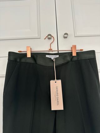 Pantalones de vestir Gerard Darel en color verde. Cuentan con un diseño elegante y moderno. - Cintura con detalle de satén. - Corte recto. Pantalones de pinzas con detalle satinado en cintura color verde botella, de Gerard Darel talla 38, adjunto medidas nuevos con etiqueta va a conjunto con la blusa de mi perfil