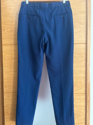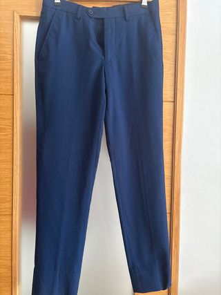 Pantalón de vestir de corte slim. - Color azul. - Talla 38. Cintura 78cms Largo pantalon 99 cms Tiene para sacar el bajo