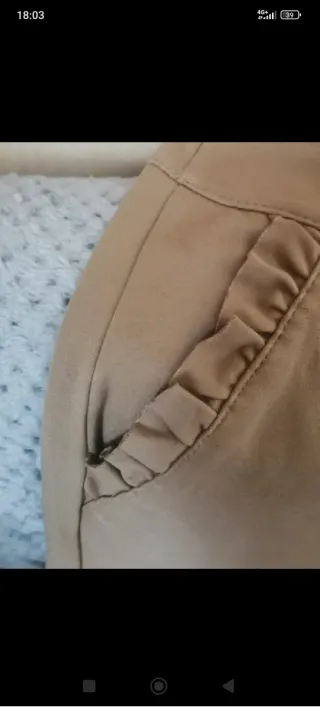 Pantalón elástico de color beige. - Diseño con volantes en los bolsillos. - Cierre de botón y cremallera. Tengo otro igual en fucsia. Los dos x 15€, y ambos sin estrenar.
