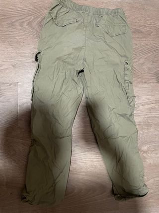 Pantalones cargo de color verde militar, con un diseño cómodo y práctico. - Cintura elástica. - Múltiples bolsillos. - Tejido ligero. -con una manchita de tinta negra.