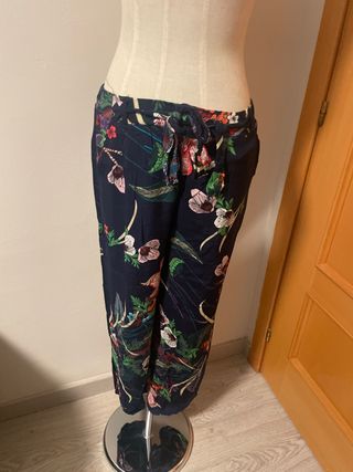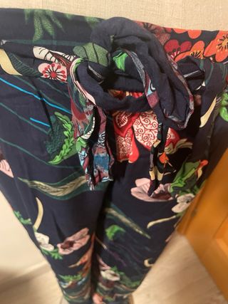 Pantalón con un llamativo estampado floral sobre fondo azul marino. La cintura es ajustable con un lazo. - Diseño con flores y hojas. - Cintura con lazada. - Corte ancho.