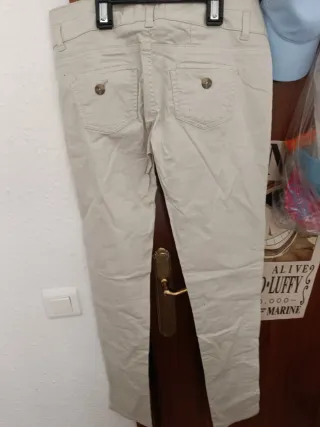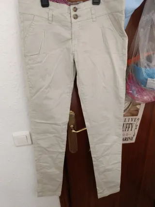 Pantalón de corte ajustado en color beige. - Cintura con trabillas. - Cierre de botón y cremallera. - Bolsillos delanteros y traseros.