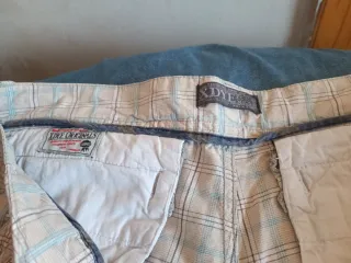 Pantalón corto con un diseño a cuadros. - Patrón de cuadros en tonos beige y azul. - Cintura con cierre de botón y cremallera.