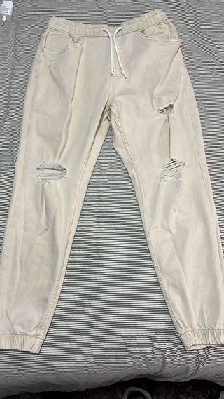 Pantalones vaqueros de corte ancho para hombre, con un diseño moderno. - Cintura elástica con cordón. - Bolsillos laterales. - Aberturas desgarradas en las rodillas. - Puños ajustados en los tobillos.