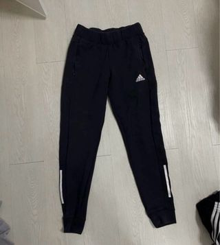 Pantalón deportivo Adidas de color azul marino con rayas blancas. Talla S - Diseño con tres rayas blancas laterales. - Cintura elástica.