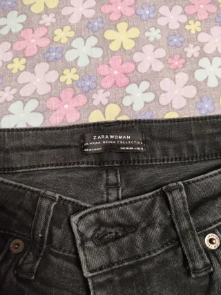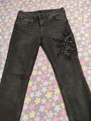 Pantalones vaqueros de mujer de la marca Zara en color gris. Tienen un diseño moderno con detalles de pedrería y encaje en la parte delantera. - Corte recto. - Cierre de cremallera y botón. - Bolsillos delanteros y traseros. - Decoración floral con pedrería y encaje.