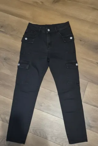 Pantalón vaquero de corte cargo en color negro. Presenta un diseño moderno y funcional. Nuevos sin usos, talla S. Se ajusta al cuerpo - Bolsillos laterales con botón. - Cintura alta. - Cierre de cremallera y botón.