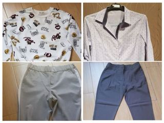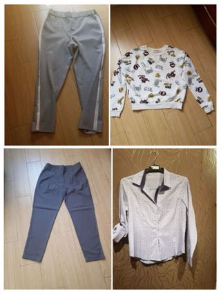 Conjunto de prendas de vestir que incluye dos pantalones, una sudadera fina y una camisa. - Pantalón gris con detalle lateral blanco, goma en la cintura de Zara. Por separado 5 €. - Pantalón gris de cintura alta con pinzas y vueltas en los bajos, es de H&M, esta un pelín metido de los lados, se puede sacar sin problema. Por separado 5€ - Sudadera blanca con estampado de letras y labios de Bershka. Por separado 5€. - Blusa azul con dibujos y manga regulable. Por separado 4€