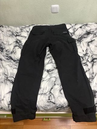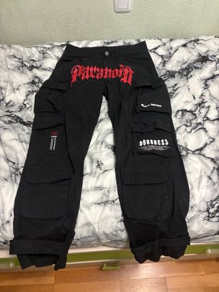 Pantalones cargo negros de la marca Black Squad. Diseño moderno y funcional. - Estampado frontal 'Paranoid' en rojo. - Bolsillos laterales con solapa. - Detalle de texto 'Black Squad' y 'Darkness' en los bolsillos. - Puños ajustables precio negociable