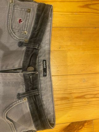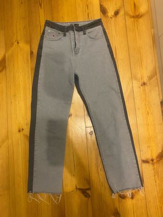 Pantalón vaquero con un diseño bicolor que combina gris y gris oscuro. - Corte acampanado. - Bajo deshilachado. - Detalle de raya lateral en contraste.