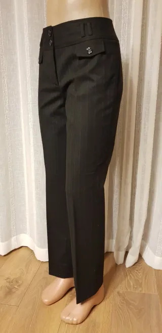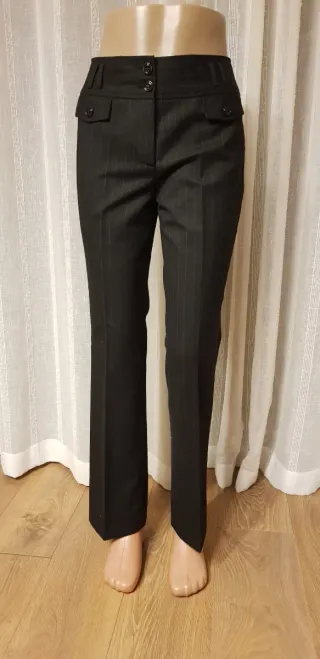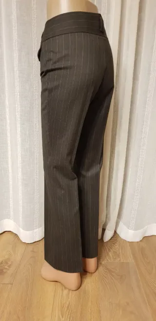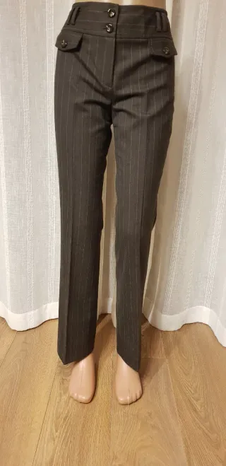 Pantalón de vestir gris con finas rayas verticales. Talla como una 38. - Diseño de corte recto. - Cintura alta con trabillas. - Cierre con cremallera y dos botones. - Bolsillos laterales con solapa y botón. Sólo venta en pedido mínimo de 60€