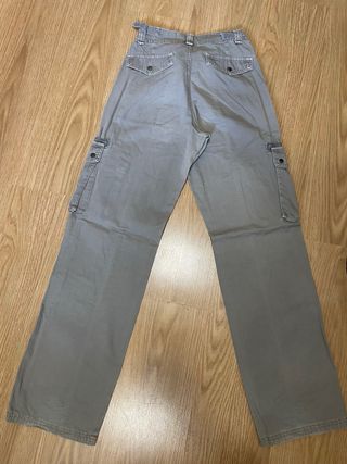 Pantalón estilo cargo en color gris. Talla 34, Bershka. - Bolsillos laterales con solapa. - Cintura ajustable con hebillas. - Costuras reforzadas.