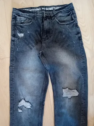 Pantalones vaqueros de corte recto con un estilo desgastado y moderno. - Diseño con rotos en rodillas y muslo. - Cintura con trabillas para cinturón. - Cierre de cremallera y botón. talla 30/32