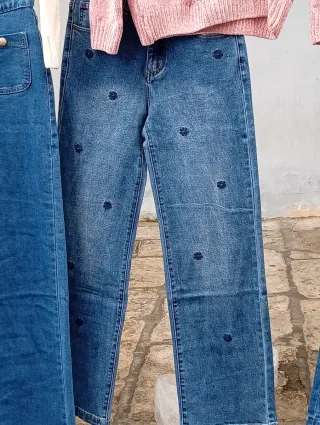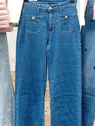 Pantalón vaquero de mujer con un diseño moderno y cómodo. - Pierna ancha. - Bolsillos delanteros con botón dorado. - Cintura alta.