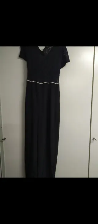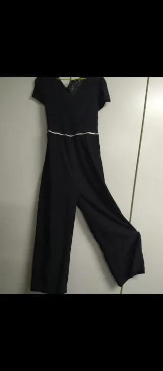 Mono enterizo de cuerpo de encaje negro con manga corta y cuello redondo y pantalón largo y ancho. Talla según la etiqueta 28 , pero mide de cintura 36, exactamente no se a q talla corresponde Mide de largo 100 y de ancho de la cintura 36 - Diseño de cuerpo entero. - Parte superior con encaje. - Cinturón decorativo blanco.
