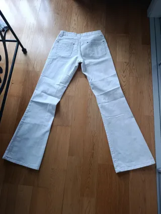 Pantalón blanco con un diseño moderno y detalles en los bolsillos. - Corte acampanado. - Adornos sutiles en la zona de los bolsillos delanteros.