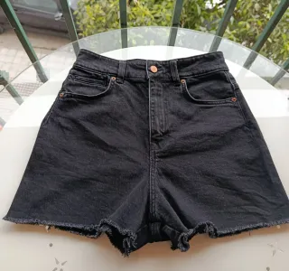 Pantalón corto vaquero de mujer. - Diseño de tiro alto. - Bajo deshilachado. - Bolsillos delanteros y traseros.