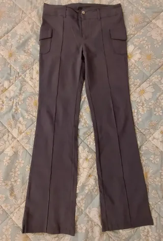 Pantalón de vestir para mujer en color gris. Diseño moderno y favorecedor. - Bolsillos cargo laterales. - Costuras frontales marcadas. - Pierna acampanada.