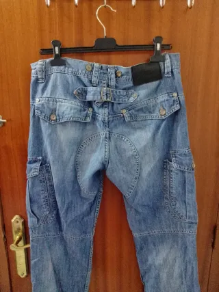Pantalón vaquero tipo cargo con un diseño moderno y funcional. - Confeccionado en tejido denim. - Múltiples bolsillos de fuelle en los laterales. - Cierre de botones en la bragueta. NO HAGO REBAJAS ENVIO APARTIR DE 30 EUROS