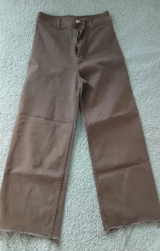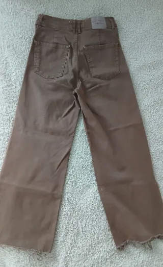 Pantalones de corte ancho con un acabado desgastado en los bajos. - Cintura alta. - Cierre de cremallera y botón. - Bolsillos traseros.