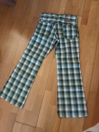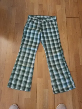 Pantalones de estilo skate con un diseño de cuadros. - Diseño de cuadros verdes y blancos. - Corte acampanado en el bajo. _rodillas reforzadas