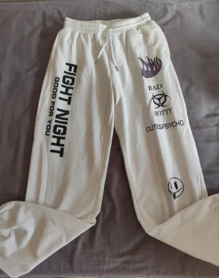Pantalón de chándal blanco con un diseño moderno y llamativo. - Estampado FIGHT NIGHT, GOOD FOR YOU en la pierna izquierda. - Estampados BAD HOTTY, CUTES&PSYCHO y un smiley en la pierna derecha. - Cintura elástica con cordón ajustable.