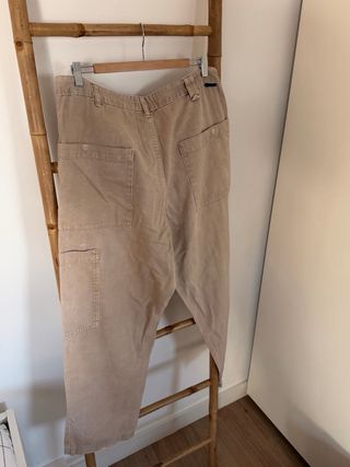 Pantalones de estilo cargo en color beige. Cuentan con múltiples bolsillos y un diseño moderno. - Bolsillos laterales con solapa. - Cintura con trabillas para cinturón. - Cierre de botón y cremallera. - Sistema de cintura ajustable