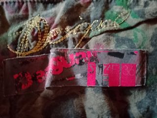 Pantalón vaquero negro con detalles rasgados y estampados. - Cintura con banda elástica y texto. - Diseño desgarrado con tela estampada debajo. - Estampado de texto y números en las zonas rasgadas. - Detalle de costuras en las rodillas.
