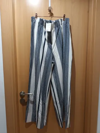 Pantalón ancho de H&M con un diseño de rayas verticales. - Color principal blanco roto con rayas azul marino. - Cintura elástica para mayor comodidad. - Ancho de pierna.