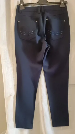 Pantalón Chica Azul Marino 5 Bolsillos Botón y Cremallera En los Bolsillos de detrás lleva unas piedrecitas de adorno Se ha puesto una vez MEDIDAS: Cintura------35 cm. Tiro----------26 cm. Largo--------90 cm. Viscosa, Nailon, Elastano