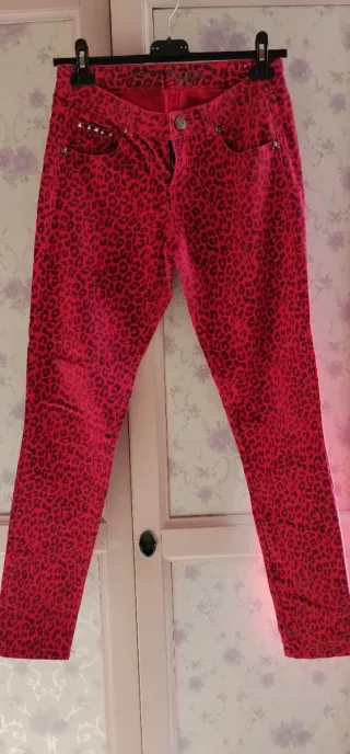 Pantalón con estampado de leopardo en tonos rojos y marrones. - Diseño llamativo. - Cierre de cremallera y botón.