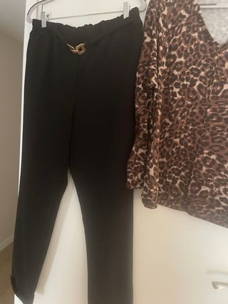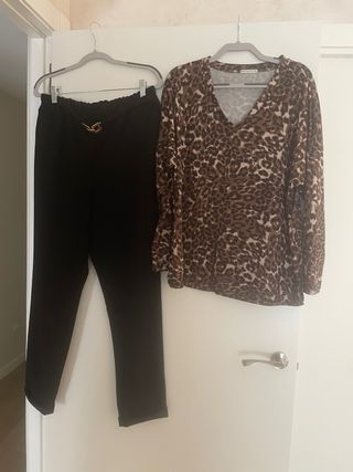 Conjunto de dos prendas de la marca Encuentro. - Pantalón negro con detalle dorado en la cintura. - Top de manga larga con estampado animal print en tonos marrones.el sueter mide 60 cm de axila a axila y el pantalon 40 cm de cintura...y 100 cm de largo
