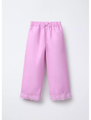 Pantalón recto de color rosa con detalle de puntilla en el bajo. Cierre con cordón. - Cintura elástica. - Bajo con puntilla.
