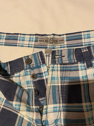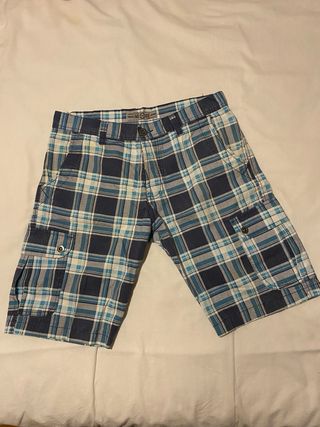 Pantalón corto de estilo cargo con estampado de cuadros. - Diseño de cuadros en tonos azules y blancos. - Bolsillos laterales con botón. - Cintura con trabillas para cinturón.