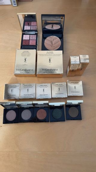 Lote de maquillaje Yves Saint Laurent valor real más de 236 € - Incluye paleta de sombras Couture Mini Clutch. - Incluye polvo compacto All Hours Hyper Finish. - Incluye 5 sombras de ojos individuales: 3 Satin Crush y 2 Lame Crush. - Incluye 2 labiales Rouge Volupté Shine.