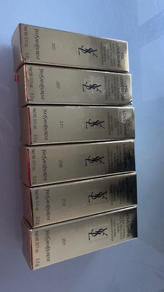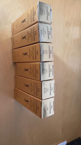 Lote de 7 barras de labios YSL Love Shine. - Tono 211 Ardent Carmine - Tono 201 Rosewood Blush - Tono 212 Deep Ruby - Tono 207 Scenic Brown (x2) - Tono 208 Raspberry Shine