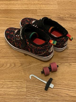 Zapatillas Heelys con un diseño llamativo y multicolor. Talla 34 - Incluyen las ruedas y la herramienta para cambiarlas. - Cierre de velcro para un ajuste fácil.