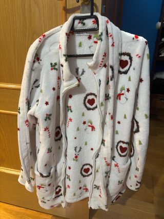 Bata de Navidad polar con cremallera, bolsillos y cinturón. Tiene algunos signos de uso pero muy leves, apenas se notan.