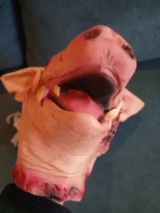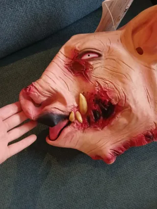 Máscara de látex con diseño de cerdo zombie, ideal para carnavales o Halloween. - Detalles realistas de heridas y colmillos. - Orejas y hocico característicos de un cerdo. - Muy buena calidad. Sin usar nunca.