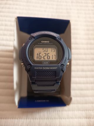 Reloj Casio digital con correa azul y resistencia al agua de 50 metros. - Resistente al agua 50M. - Iluminador. - Alarma y cronógrafo.