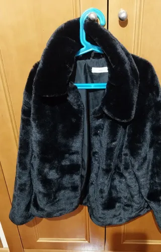 Abrigo de pelo sintético con un diseño moderno y cálido. - Cierre con enganches dorados y detalles en negro. - Cuello amplio y peludo. - Tacto suave y agradable.