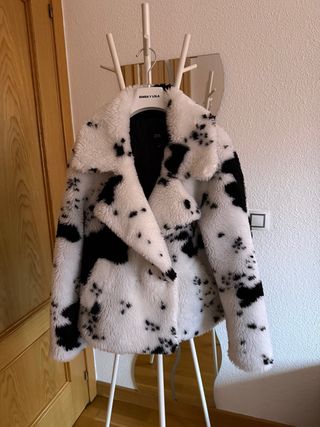 Abrigo de pelo sintético con estampado de vaca. - usado en un par de ocasiones esta nuevo. - Diseño llamativo y moderno. - Tacto muy suave y agradable. - Cuello solapa.