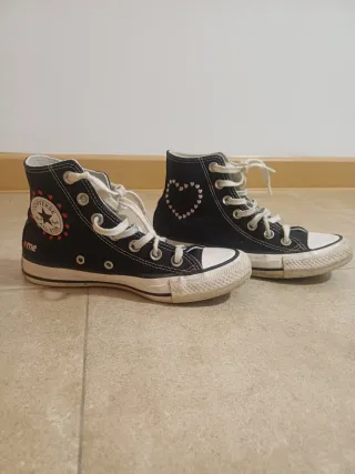 Zapatillas altas Converse para niña con un diseño encantador. - Color negro con detalles en rojo. - Adorno de corazones en la parte exterior. - Cierre con cordones blancos.