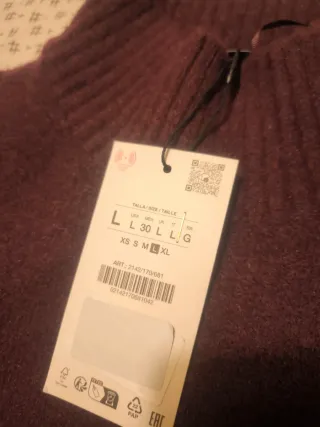 Jersey de punto de Zara en color burdeos, talla L. Presenta un diseño de cuello alto y manga larga. - Tejido suave y agradable al tacto. - Puños y bajo acanalados.