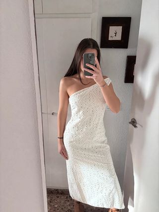 Vestido blanco calado bordado midi tirante asimétrico Zara. 100% Algodón. Forro interior también el algodón. Disponible en talla S y M. Precio no negociable. Hago envíos