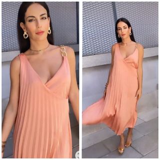 Vestido plisado en color rosa asalmonado mandarina con tirante cadena dorada Zara. Disponible en talla S (da talla, puede servir a una M perfectamente). Nuevo a estrenar con etiqueta. Queda espectacular. Precio no negociable. Hago envíos #vestidoplisadozara #vestidoplisadocadenazara #vestidosalmónzara #vestidoplisadocadenazara #vestidotirantecadenazara