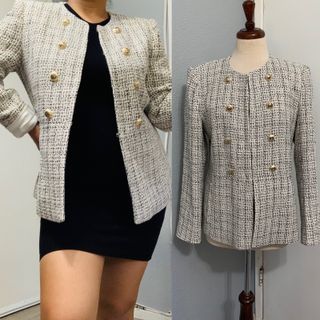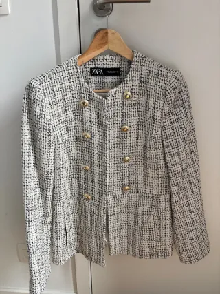 Elegante blazer de Zara con un diseño de tweed y estructura definida. Talla XS. Nueva con etiqueta. Precio no negociable - Cierre de botones dorados. - Cuello redondo. - Corte entallado.